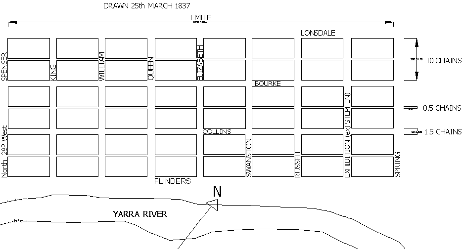 "I staked the main streets ninety-nine feet wide, and after having done so was ordered by the Governor (Bourke) to make them sixty-six feet wide; but upon my urging, and convincing him that wide streets were advantageous on the score of health, and convenience to the future city of Victoria, he consented to let me have my will." Robert Hoddle.